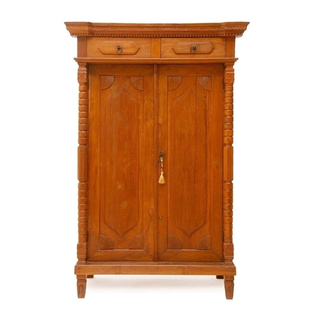 De madera de teca tallado, con dos cajones y dos puertas. Origen: Isla de Java, Indonesia. Medidas: 115x053x173h