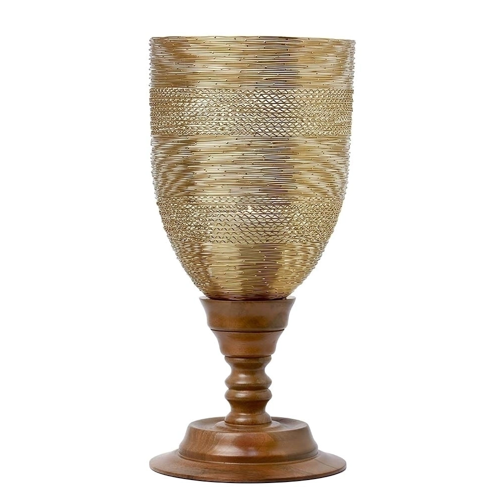 Fanal decorativo con estructura de madera y porta vela de metal calado en tono dorado, ideal para aportar calidez y un toque artesanal a tus espacios.