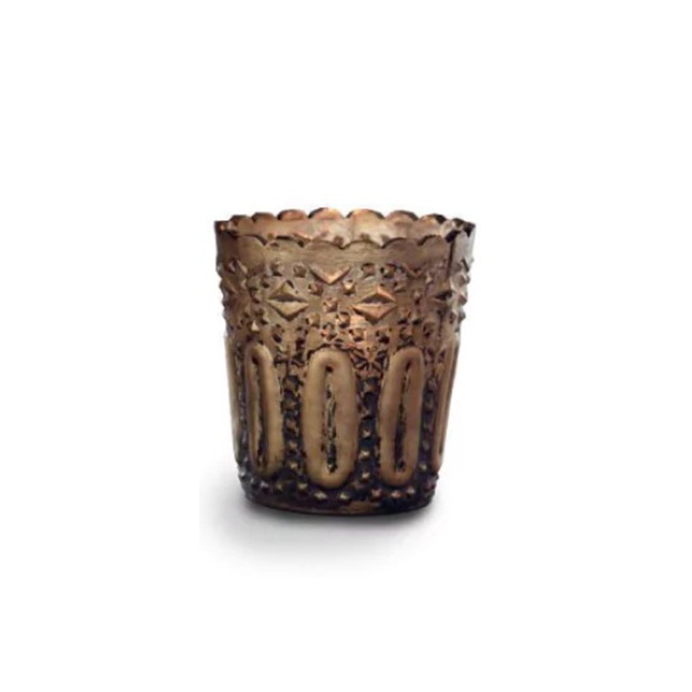 Candelabro de vidrio soplado a mano con patina dorada y relieve decorativo, ideal para crear una iluminación tenue y un ambiente acogedor.