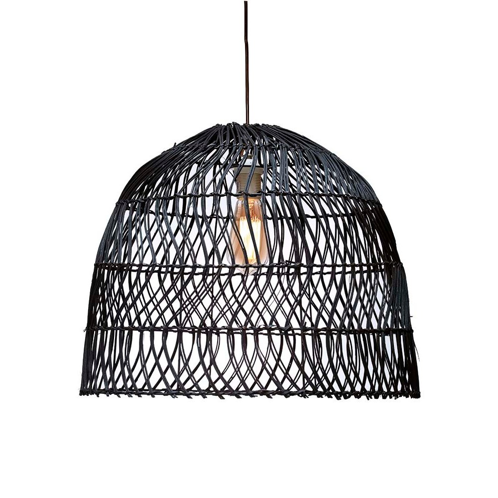 esta lámpara de origen indonesio alterna franjas de entramado cerrado y abierto, generando un juego de luces y sombras envolvente. Aporta un acento artesanal en livings, comedores o espacios semicubiertos.